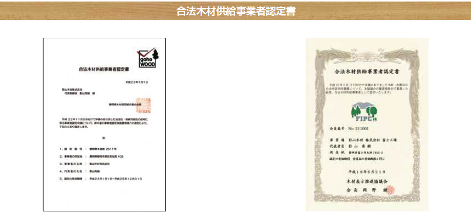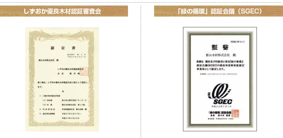 | 弊社は、違法伐採から産出された木材ではなく、合法木材供給事業者としての認定を受け、合法木材のみを取り扱っております。また、「しずおか優良木材認証審査会」からは、県産材(品質基準も含む)証明を、また、SGEC 森林認証の取得もしており、単に合法であるだけではなく、「緑の循環」認証会議という第三者機関が認定した環境に配慮した森林経営を認証された木材の加工管理証明も取得しております。 | ![]() |
