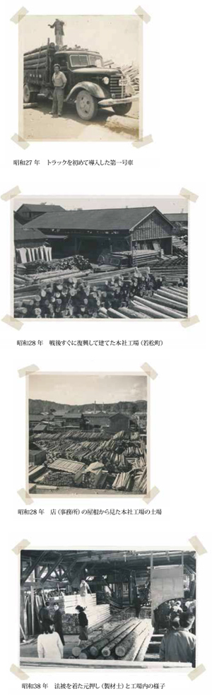 昭和 長きにわたる戦時下の難局を経て、昭和23 年、影山木材株式会社がスタートする。戦後復興〜焼け野原から工場を再興し、高度成長の時代〜昭和40年50 年代は、事業拡大の時期である。多様なニーズに応えるべく、多角的な経営の始まりである。
